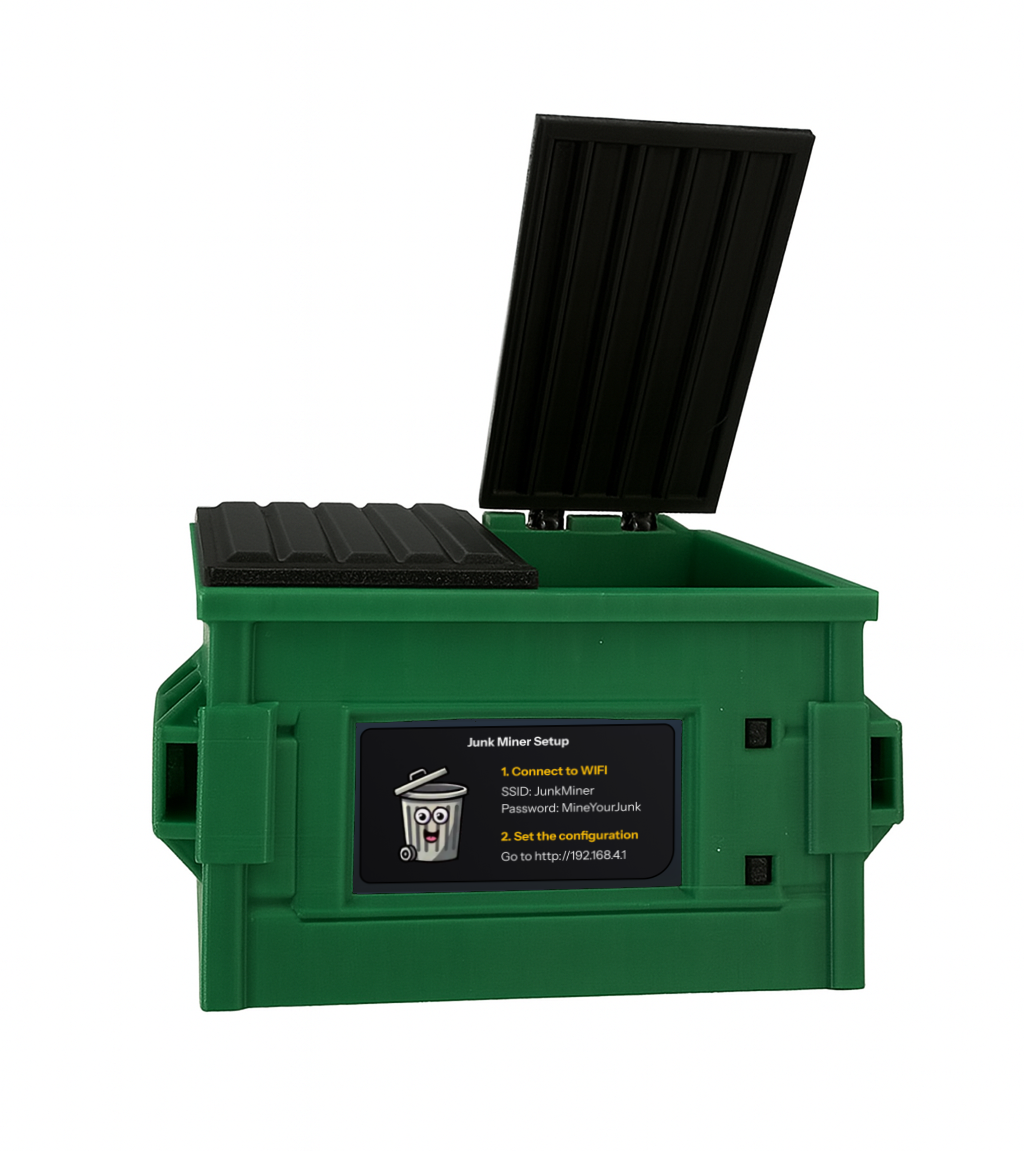 Introducing the official JunkCoin Dumpster — a rugged, ready-to-run rig shaped like a miniature dumpster. Mine $JNK and $BTC with our dual-mining firmware, powered by the NEW JunkCoin BTC pool. Ready to go straight out of the box!
