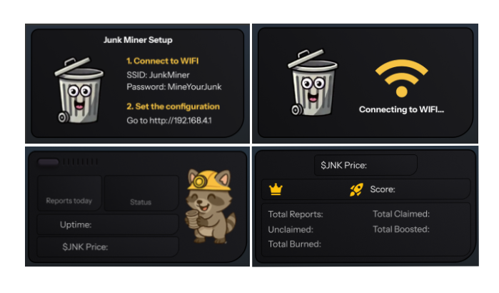 Includes a pre-flashed T-Display-S3 with JunkCoin’s dual mining display firmware. Housed in the signature Dumpster with a front cut out for the T-Display to show live mining stats, a cute raccoon mascot, and performance metrics. (US power adapter included)