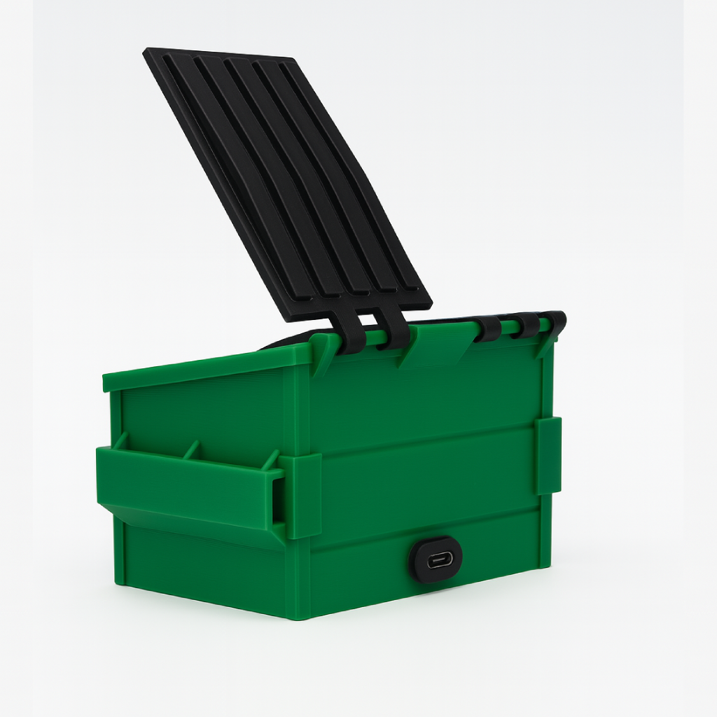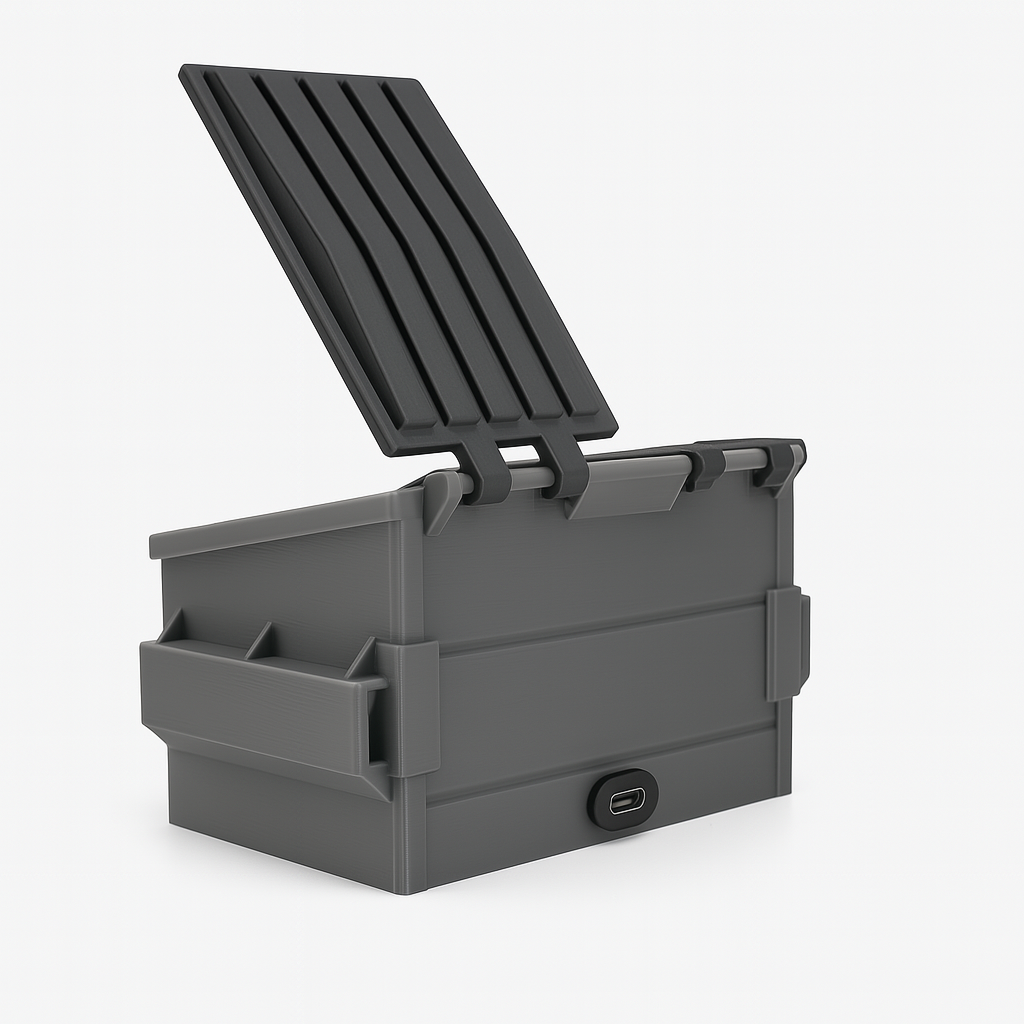Includes only the Dumpster Housing case — no device. Perfect for display or installing your own ESP32 (all ESP32 devices fit). Features a side opening for easy cable access to your ESP.